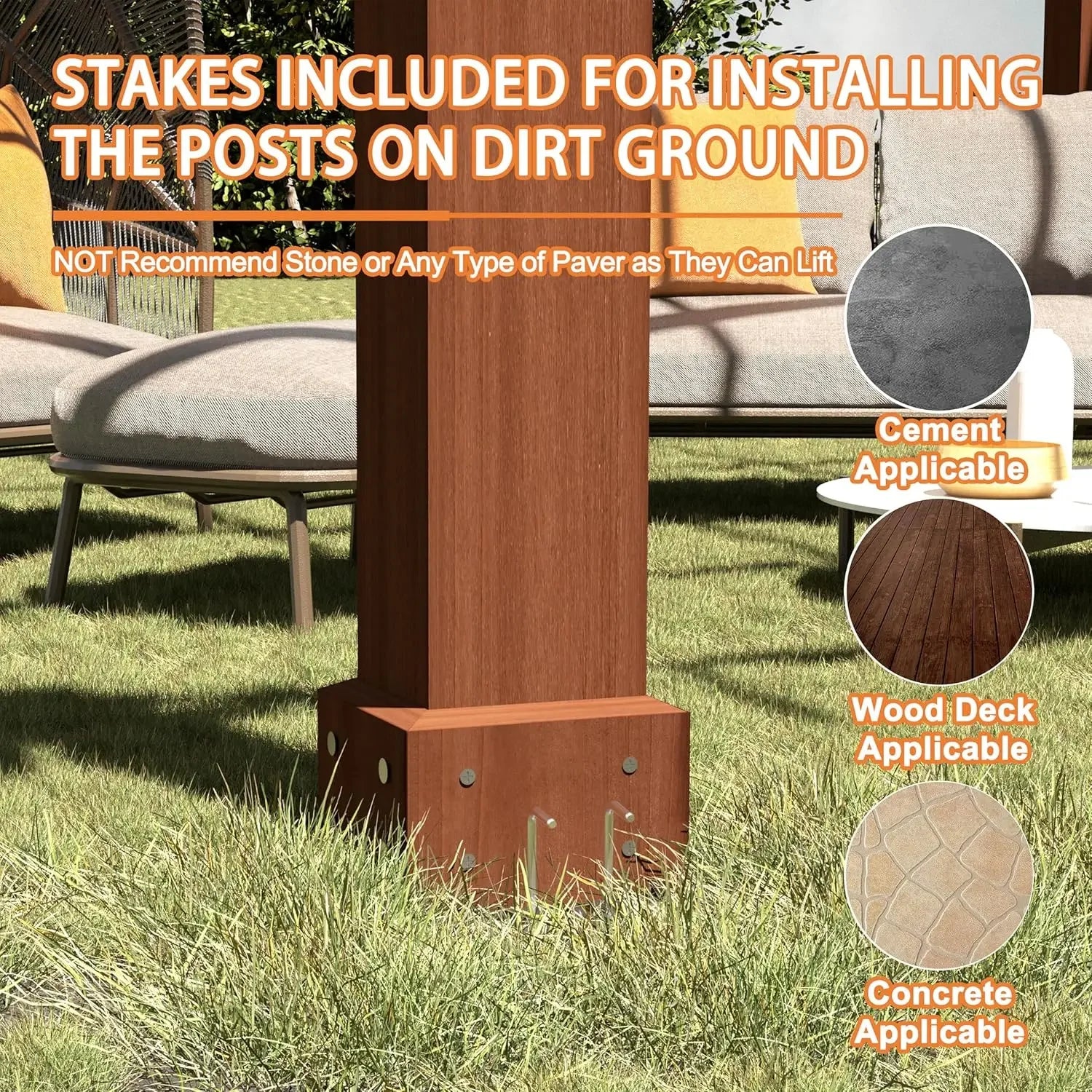 - [Stakes Included] You can use stakes (included) to mount the pergola to any grass, wood deck or cement outside. If you want to strengthen the stability of the wood pergola, you can use expansion screws (not included).