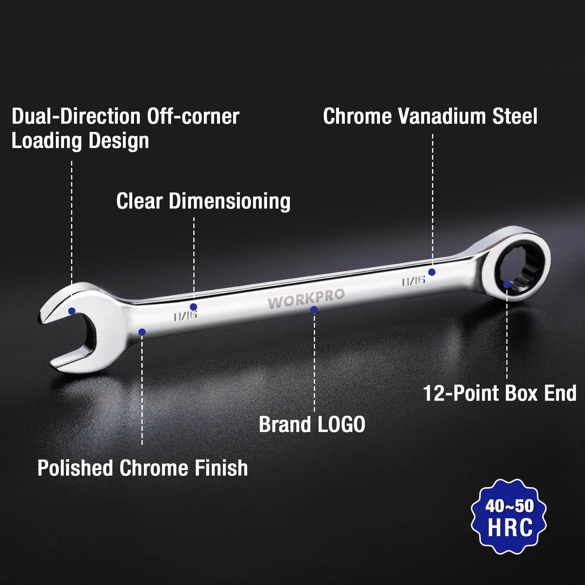 Comprehensive Application Scenarios: WORKPRO combination wrench sets have a wide range of application scenarios, including motorcycle repair, auto repair, home projects, bicycle repair, machinery repairs, garage engineering, and so on.