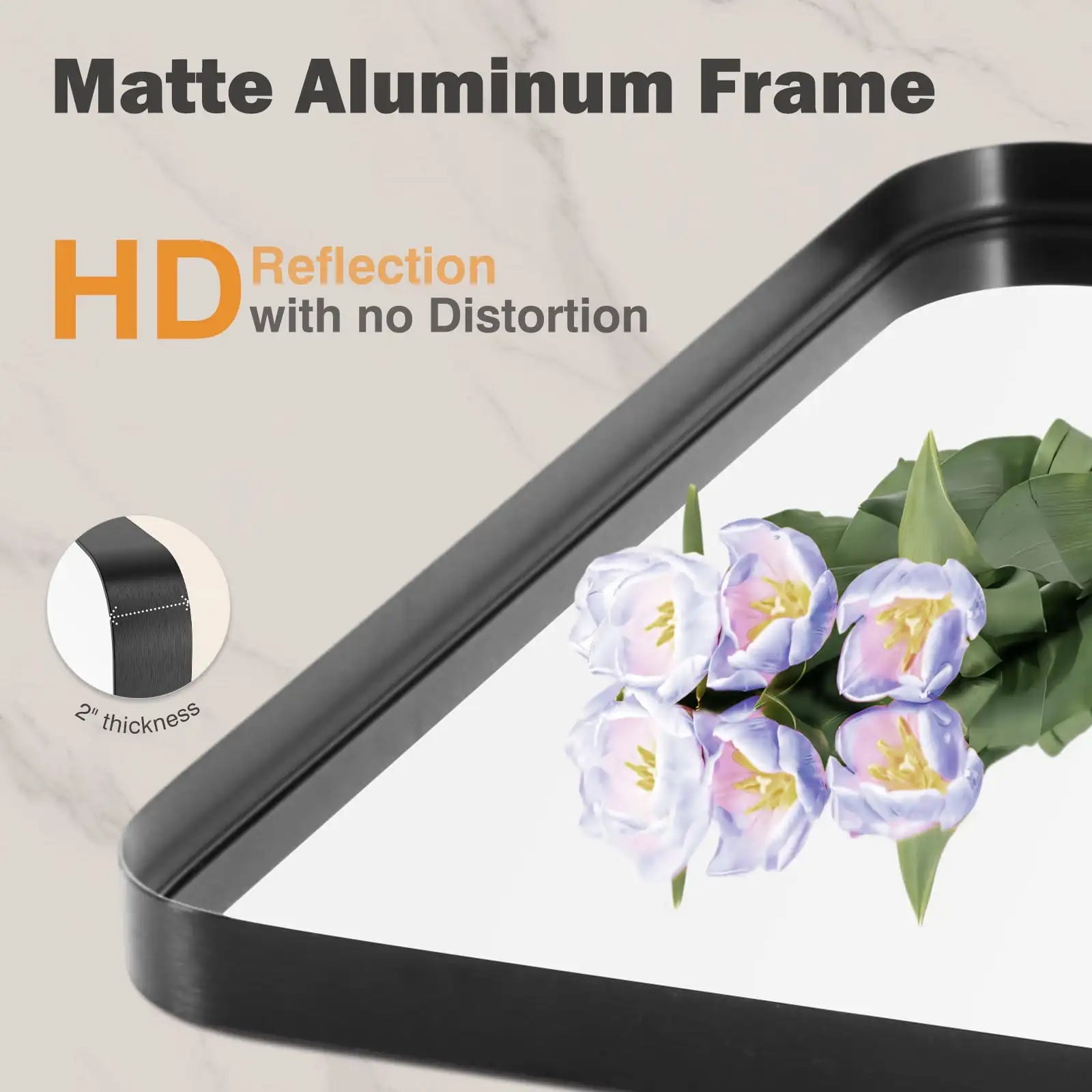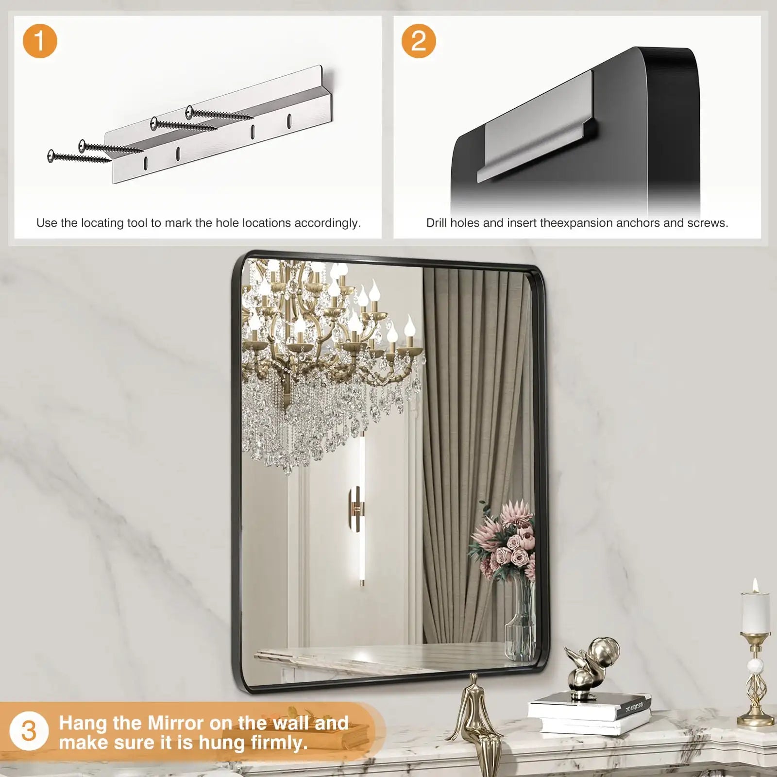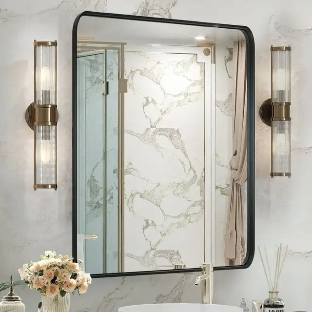 【Durable & Secure Mirror】 Our Bathroom Mirror is designed with an aluminum alloy frame that is rust-resistant and features 5MM tempered glass, providing five times the strength of standard mirrors. The metal-framed mirror is constructed with an explosion-proof membrane, ensuring a safe and secure experience for everyday use. 【Clear Reflection & NO Distortion】: Our bathroom vanity mirror is crafted with high-definition float glass to provide a clear reflection and achieve a 1:1 accurate restoration of the real image without any distortion. Perfect for creating the ideal portrait view in your bathroom, bedroom, dorm room, or closet door. 【Contemporary Design】: Our round rectangular wall mirror features a sophisticated and modern industrial aesthetic. Crafted with a sleek brushed black metal frame, this mirror's unique round angle design not only adds a protective element but also elevates the overall look. Perfect for a bathroom remodel, the high-definition mirror surface enhances light and adds visual interest, creating a safer and more upscale ambiance compared to traditional recessed frames. 【Versatile Design】 This mirror can be hung vertically or horizontally to suit your preference. It can be used as a tabletop makeup mirror or leaned against the wall for easy access. Additionally, it is suitable for installation and secure mounting on the bathroom wall. 【Easy Assembly】 Assembly of the GIANNA Bathroom Mirror is a breeze, with easy-to-follow instructions and all required hardware included for a seamless setup. Mounting the mirror on your bathroom wall is quick and easy, ensuring you can start enjoying its benefits without delay.