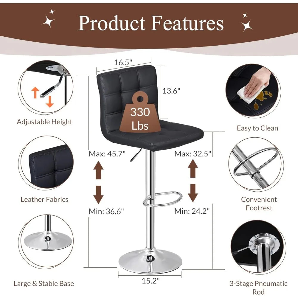 【Height Adjustable】-- The height of the bar stools can be adjusted from 24.2-32.5 inches with air-lift handle, and the bar can rotate 360 degrees. The metal frame of the bar is very strong and reliable