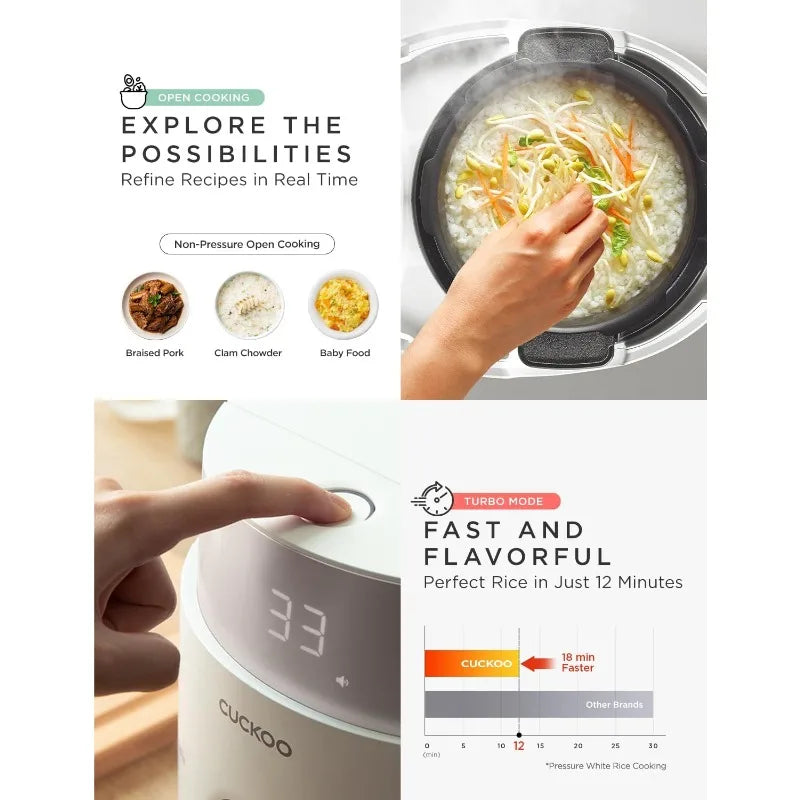 - CUCKOO TWIN PRESSURE TECHNOLOGY: Choose between pressure cooking or non-pressure cooking for specific and customized desired results—high pressure will yield deliciously made sticky rice while non-pressure will result in unbelievably fluffy rice!