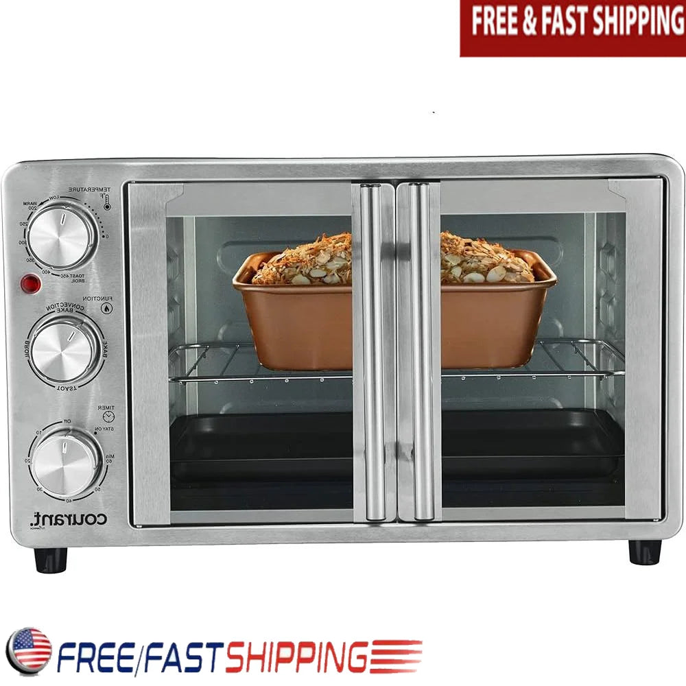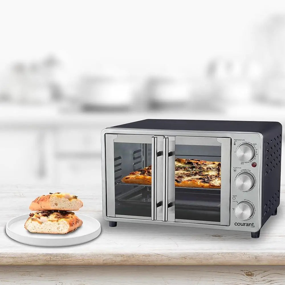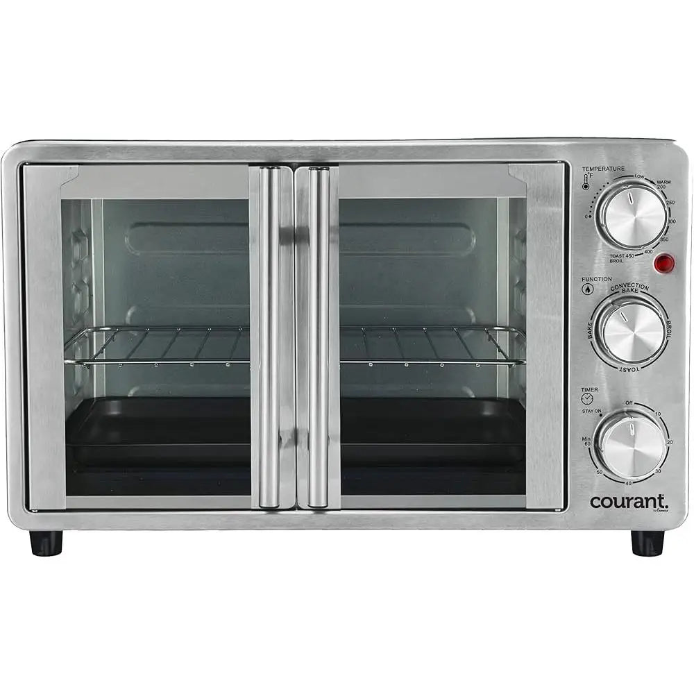 About this item Cooking Made Simple: The Courant French Door Convection Toaster Oven & Broiler is a multifunctional appliance that simplifies cooking. This toaster oven is ideal for a range of cuisines because it can fit a 9x13 baking pan (without handles), a 10" pizza, or 6 pieces of bread. Its three rack settings, which include a toast rack, baking pan, and a removable crumb tray for simple cleanup, make it simple to prepare many sorts of food at once. Powerful Oven with Temperature Control: The Courant French Door Convection Toaster Oven & Broiler features an integrated fan that circulates heat to cook meals consistently. You can cook your food to perfectly with the 200–450°F temperature control, getting ideal results each and every time. Stainless Steel and French Door Design: Our Convection Toaster Oven features a stylish french door with tempered glass doors and durable design that is perfect for any kitchen décor. The compact size of the oven makes it simple to store, and the power indicator light lets you know when the oven is on. Convection Oven with 3 Control Knots:. With its simple controls, you can easily select the temperature and timing. It also has a stay-on mode that makes it simple to cook for longer periods of time. Gives you peace of mind and guarantees that your food is consistently cooked to perfection by turning off automatically when baking time is up. Perfect for Any Home: Whether you're a busy parent seeking for a practical and adaptable appliance or a student living in a small dorm room, this compact but powerful toaster oven is ideal for anyone who enjoys cooking and wants to sample numerous recipes thanks to the variety it offers.