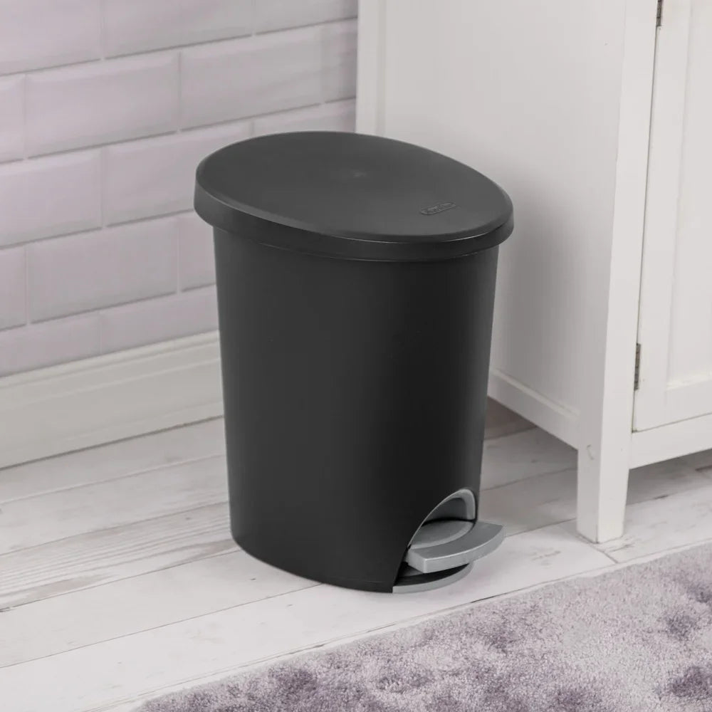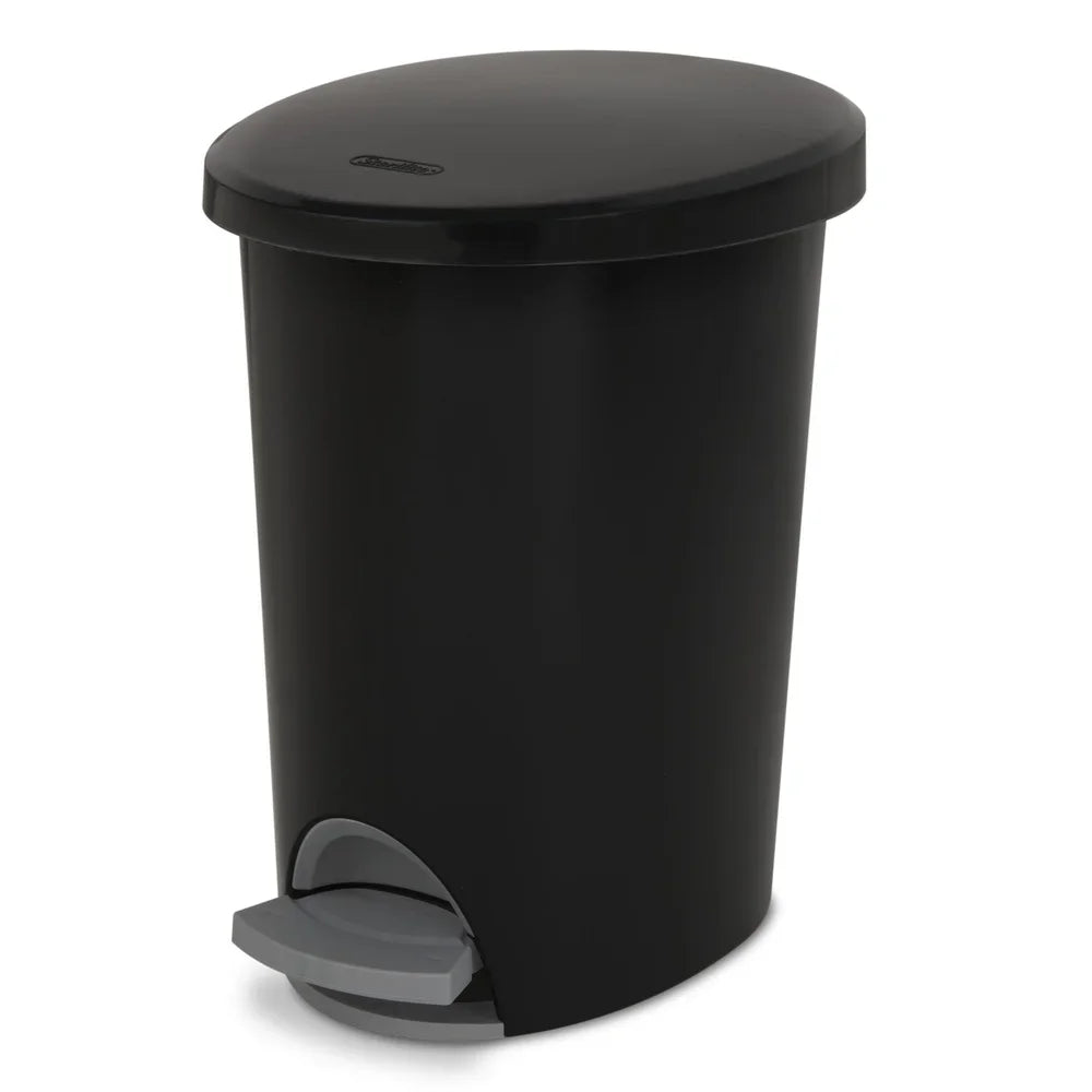 The 2. 6 Gallon Ultra™ StepOn Wastebasket provides convenient, step-on access for hands-free opening while hiding contents from sight. The lid opens easily by stepping on the foot pedal and closes tightly when released. The slim, oval design makes this wastebasket ideal for use in narrow spaces within the bathroom, bedroom or home office and the lid helps contain odors. The removable liner includes a bag holding feature that helps keep a standard plastic shopping bag or 4-gallon trash liner in place when the wastebasket is in use. This Wastebasket has a smooth textured surface that is easy to clean. The overall assembled dimensions of this item are 11 1/2" L x 9 1/4" W x 13 3/8" H.