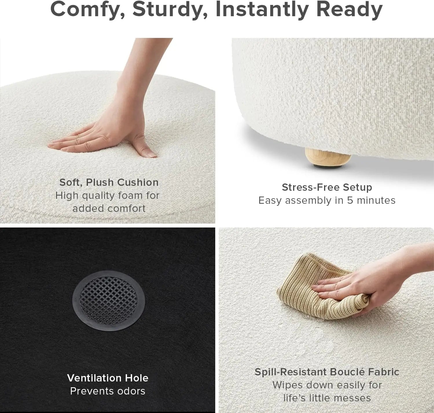Luna Round Ottoman with Storage and Tray, Round Coffee Table with Storage, Upholstered Foot Stools Ottoman for Living Room, Bedroom, with Solid Rubberwood Legs (Pearl White Performance Boucle)