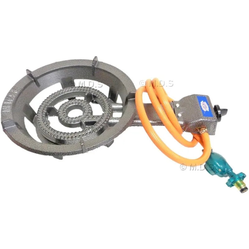 - -Portable Propane Gas Burner 13" Outdoor Stove Camping Tailgating Super Jumbo with Electric Igniter that includes Hose and regulator 30,000 BTU Material: Heavy Duty Made Cast Iron Stove