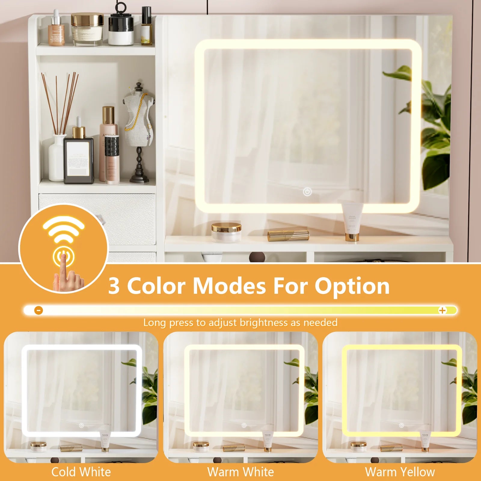 Vanity Desk with LED Lights Mirror: The makeup vanity desk is equipped with a large lighted mirror that can be adjusted in 3 colors: cool white, warm white, and warm yellow. Whether you need natural light or bright light, it can easily meet your needs just click the button in the middle of the mirror, and you can easily switch the light as you need.