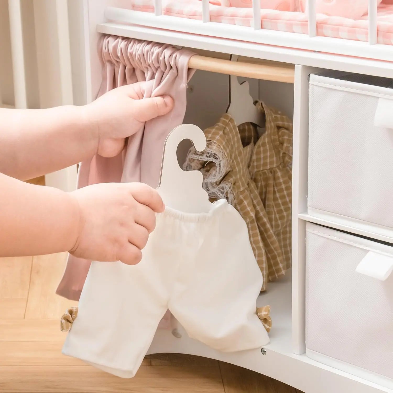**All-in-One Baby Doll Crib Set**: This versatile baby doll bed combines a crib, changing table, and storage unit into one functional playset. With designated areas for doll clothes, toys, and pretend baby toiletries, it features ample storage space that mimics a real wardrobe. The set includes two baskets and three wooden hooks, making it easy for children to organize and access their doll’s essentials.