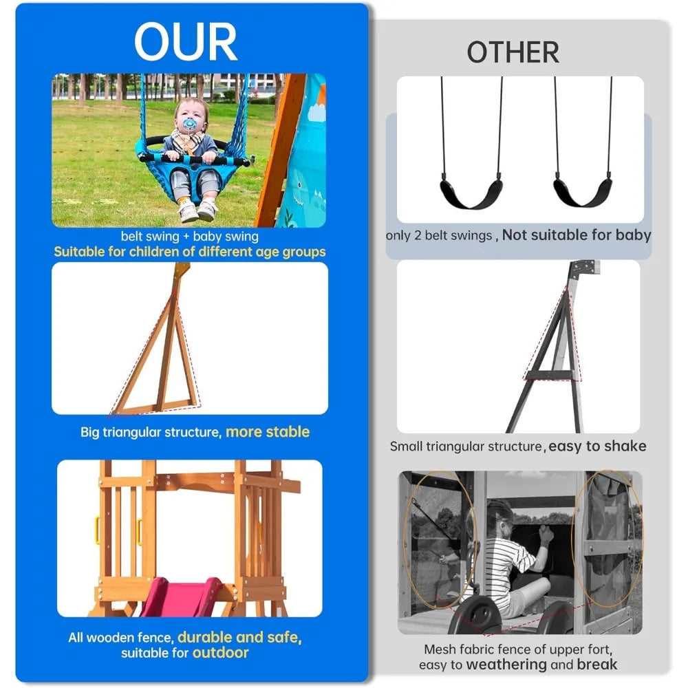 - Fun-filled Variety: Featuring activities like climbing, sliding, sports, and imaginative play, the kids playground backyard set offers a diverse array of entertainment options. Designed to encourage physical activity and foster creativity, this play sets for backyard ensures endless hours of enjoyment for children.